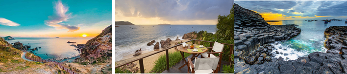 - Đến nơi, Quý khách hòa mình vào thiên nhiên, một bên là biển nước màu xanh lam trong vắt, một bên là núi đá cao sừng sững. Khám phá bãi cát dài mịn, khung cảnh hoang sơ đầy quyến rũ, đặc biệt được chấm phá bằng những công trình đặc sắc như Cầu Yến, Cầu Trái Tim, Kỳ Co Resort,… và những hang đá, suối nước đẹp đến bất ngờ.